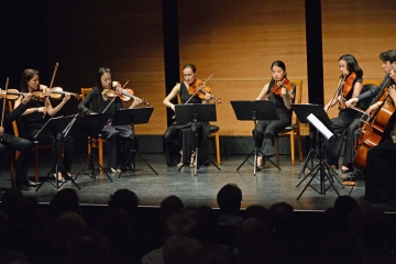 Veranstaltung: Quatuor Hermès & Quatuor Ardeo: Enescu und MendelssohnEin Oktett ist irgendwie doch mehr als nur zwei Quartette, die miteinander Kammermusik machen. Und in diesen zwei Werken sowieso, hatten doch beide Komponisten mit dieser Besetzung offenbar vielmehr ein kleines Streichorchester im Sinn. Beim rumänischen Komponisten George Enescu ist diese Erklärung aber immer noch unzureichend, denn es gab hier Passagen, in denen jede/r MitspielerIn eine eigene Stimme bekam, was im Streichorchester wohl eher selten der Fall ist. Ein ganz schönes Durcheinander kann es da geben. Dass hier im bosco Enescus Streichoktett C-Dur op. 7 von 1900 dennoch transparent blieb, ist vor allem der bereits längeren Zusammenarbeit der beiden Ensembles zu verdanken, die es hier verstanden, jeden Gedanken in präziser Homogenität auf den Punkt zu bringen. Das gemischte Quatuor Hermès und das rein weiblich besetzte Quatuor Ardeo sind vom Charakter her recht unterschiedlich. Während ersteres – wie am Abend zuvor überzeugend dargelegt – die feinsinnige kammermusikalische Spielweise pflegt, geht es den vier Damen vor allem darum, ihrem Ensemblenamen (Ardeo = ich brenne) gerecht zu werden. Jedenfalls fiel die intensivere Aktivität letzteren Ensembles schon ins Auge. Musikalisch ergänzten sich die beiden Zugriffe aber erstaunlich stimmig, ja sie schienen sich geradezu gegenseitig zu beflügeln. Und an Ansporn konnten die Musiker nicht genug bekommen, ging es hier doch um zwei Werke genialer Komponisten, die in ihrem jugendlichen Übermut eines 19Jährigen, bzw. bei Mendelssohn gar 16Jährigen, alle Register gezogen haben, die ihnen nur in den Sinn kamen. Und das bescherte dem Klassikforum-Programm wohl eines der intensivsten und kraftvollsten Konzerterlebnisse seit der Gründung der Reihe.