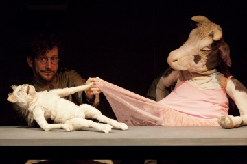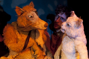 Das Theater Zitadelle Berlin hat aus dem Stoff der „Bremer Stadtmusikanten“ unter der Regie von Pierre Schäfer eine derart zu Herzen gehende, ideenreich-witzige Puppenkomödie gemacht, dass das bosco-Publikum hin und weg war: Der alte Kunstgriff der Tierfabel als Stellvertretergeschichte für Menschlich-allzu-Menschliches – hier hat er eine großartige Neuauflage erlebt, mit Situationskomik, Musik und sogar einer Portion Sozialkritik. Regina und Daniel Wagner agieren als Figurenspieler auf einer Bühne, wie man sie vom klassischen Puppentheater her kennt: Regina spricht die mit Käthe-Jaenicke-artigem Tonfall gesegnete Kuh und die nicht minder schrullige Spätzin, Daniel den an einen pensionierten Piraten erinnernden Wolf und die allzeit aufsässige Katze – beide menschlichen Akteure bleiben beim Hantieren mit ihren Figuren jederzeit sichtbar, und doch sind es die Tiere, deren Stimmen und Charaktere die Aufmerksamkeit des Zuschauers völlig in ihren Bann ziehen. Im Altersheim sehen sich die armen Viecher dem Befehlston des geldgierigen Personals in Gestalt von „Schwester Gisela“ (Regina Wagner) und Pfleger Eugen (Daniel Wagner) ausgesetzt, die ihnen sämtliche Wertgegenstände abnehmen und von morgens bis abends vorschreiben, was sie zu tun haben: Da wird dann Seniorengymnastik mit viel „Aua“ betrieben, und der bei der „VKK“ (Vogelkrankenkasse) versicherte Spatz aufgefordert: „Schauen Sie mal in den Cholesterinspiegel!“ Die Kuh mit dem Bluthochdruck bekommt derweil zu hören: „Lassen Sie besser mal ´n paar Milchprodukte weg!“