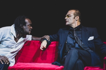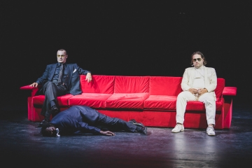 Veranstaltung: Theater an der Ruhr: "Othello" von William ShakespeareVier Menschen sitzen auf einem sehr großen, sehr roten Sofa, dem Publikum direkt gegenüber. Vier weiße Menschen: zwei Herren, zwei Damen, mal in Weiß, mal in Schwarz gekleidet, alle tragen Sonnenbrillen und sehen gelangweilt ins Nichts. Es beginnt ein ebenso gelangweiltes Gespräch, mehr ein Small Talk, in dem es um Gunst und Missgunst geht, um die Frage, wer dazu gehört und bei wem man sich wundert über die Zugehörigkeit. „Der Schwarze“, erfährt man, will dazugehören. Was maßt er sich an?
