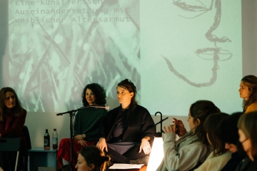 Begleitet wird die Ausstellungseröffnung durch eine Lecture-Performance, die sich mit dem Thema der weiblichen Altersarmut auseinandersetzt, sich also ebenfalls mit der Rolle von weiblich gelesenen Personen als Leidtragende von gesellschaftlich konstruierten Geschlechterrollen beschäftigt und damit weiterhin Geld im Kontext weiblicher Erfahrungswerte betrachtet und hinterfragt. Dargeboten wird die Performance von den Sprecherinnen Alexandra Rau, Sara van der Weck und Shirli Volk, performativ begleitet von der Künstlerin Maria Berauer. Die drei Sprecherinnen tragen in drei Akte unterteilt drei Geschichten von Betroffenen vor, die sich fragmentarisch aus Interviewausschnitten der drei dargestellten Personen zusammensetzen. Dabei werden anhand der unterschiedlichen und individuellen Erfahrungen drei übergeordnete Themenbereiche offenbart, die dem Erleben weiblicher Altersarmut zugrundeliegen. Der ersten Akt betrachtet das Scham- und Schuldgefühl und erzählt von einer unverheirateten Frau, der nach 40 Jahren Arbeit und dem Einzahlen in die Rentenkasse kaum genug Rente zum Leben bleibt und die nun nach dem lebenslangen Kampf gegen ein System, dass sie stets unterdrückt hat, von genau diesem System abhängig ist und sich innerhalb dieser Ambivalenz selbst die Schuld an ihrer Armut gibt. Im zweiten Akt wird das Minderwertigkeitsgefühl und die Einsamkeit thematisiert, wir erfahren im vorgetragenen Text von einer alleinerziehenden Frau, die sich nach einer plötzlichen Kündigung mit dem Verkauf von Zeitungen über Wasser halten musste - eine gesellschaftlich so stigmatisierte Beschäftigung, dass sich das Stigma auf sie selbst übertrug und die anfängliche Nebentätigkeit zur einzigen Möglichkeit auf Arbeit wurde, wodurch sie aus ihrer Heimatstadt aufgrund der hohen Mieten wegziehen musste und damit in ihrem Gefühl, nichts wert zu sein, bestätigt wurde. Der letzte Akt erzählt von der absoluten Selbstaufgabe und beschäftigt sich mit der Geschichte einer Frau, die ihr eigenes Leben stets unter die ihr sozial zugeschriebene und gesellschaftlich aufgebaute Mutterrolle stellte und sich und ihr Leben völlig der Frage unterwarf, möglichst keine Last für ihre eigenen Kinder werden zu wollen und bloß keine Schulden zu hinterlassen, was sie selbst, ungeahnt von der eigenen Familie, immer weiter in die Armut rutschen ließ.