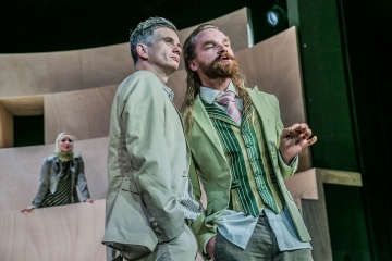 Das Theater Erlangen hätte ja, wie im bosco erkennbar wurde, in seinem Ensemble durchaus „Typen“ zu bieten, die über das hehre Wort hinaus ein wenig „Butter bei die Fische“ zusteuern könnten: Ralph Jung ist endlich mal kein Methusalem-alter „Nathan“, sondern ein erfrischend offenherziger Weiser, hart an der Grenze zum Naiven; Hermann Große-Burg gibt dazu einen stattlichen „Sultan Saladin“, der im grünen Anzug allerdings eher an einen pragmatischen OPEC-Minister gemahnt: „Ich bin auf Geld gefasst, und er will Wahrheit!“, seufzt Nathan einmal über so viel Geradlinigkeit. Der „junge Tempelherr“ wiederum (Benjamin Schroeder) ist in seiner angedeuteten Ritterrüstung als Christ und Retter der vermeintlich jüdischen Nathan-Tochter Recha wirklich schweren Konflikten und Gefühlswallungen ausgesetzt – diesen aufgewühlten Part aufs Wort zu verpflichten und ihn so zu zügeln, bedeutet eine heikle Gratwanderung.