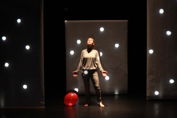 Anfangs rollt die kreisrunde, noch kleine Lichtscheibe frech über die Leinwand, mal direkt auf die Tänzerin zu, die ausweichen muss, mal umkreist es diese. Irgendwann fängt Laura Heinecke das kleine Licht mit ihrem Shirt ein, lässt es sich über den Körper rollen, bis es ausweicht und ihr über den Rücken kullert. Dann beginnt es zu wachsen, wird zum Ball, später zum Ballon, noch später weitet es sich und verwandelt sich in Wasser.