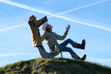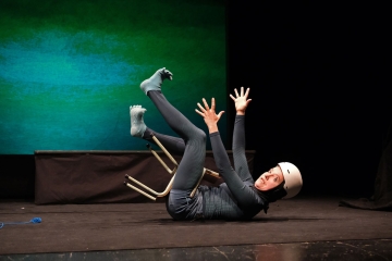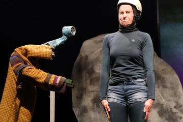 „Aus heiterem Himmel“ heißt die Geschichte, die Christiane Aahlhelm mit dem Theater Kunstdünger den Gautinger Kindern erzählt. Vielmehr: die sie ohne viel Worte spielt. Wunderbar poetisch und geheimnisvoll ist diese Theaterproduktion, die zunächst sehr still und in großer Ruhe beginnt und die staunend zuschauenden Kinder mit ungewohnten Momenten und Bildern konfrontiert. Da ist zunächst die Schildkröte allein, die Christiane Aalhelm mit Skaterhelm und Trikotkleidung als einen der ihren erkennbar gestaltet: ein Kind, das sich seinen Raum erobert und das in allem etwas Geheimnisvolles entdeckt. Nach und nach erwachen die Gegenstände ringsherum zum Leben und mischen sich ein. Die umgedrehte Bierbank mit den dort aufgesteckten Kleidungsstücken, die Stehlampe mit den über den Lampenschirm gezogenen Stulpen werden lebendig und gesellen sich ins Spiel hinein. Und gerade, als die Publikumskinder sich ausschütten vor Lachen über die lustigen Situationen, fällt „aus heiterem Himmel“ ein großer Felsbrocken mitten hinein in dieses Spiel und fordert ein Umdenken, eine Neuorientierung von Spielerin und vom Publikum. Diese Interaktion, mit wenigen, sehr bildnerischen Mitteln herbeigeführt, lässt die poetisch bezaubernde Geschichte sich immer wieder wandeln in eine Geschichte über die Gegenwart von Kindern. Denn auch dort ändern sich die Situationen „aus heiterem Himmel“. Auch dort fühlt sich eines erst sicher im Kreis der Freundinnen und Freunde - und schon wenig später ausgeschlossen. Auch dort gibt es immer die Wahl zwischen Aggression und Versöhnung.