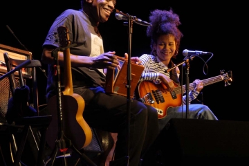 Der Dreijahresabstand der Gautinger Warning-Konzerte bietet einem als Beobachter auch die Gelegenheit, Vater und Tochter in ihrer Entwicklung und Bezüglichkeit zu verfolgen, und das nicht nur in musikalischer Hinsicht: Wally, obwohl seit einigen Jahren von einer hartnäckigen Krankheit gepeinigt, hat von seiner überwältigenden Ausstrahlung nicht das Geringste eingebüßt. „Er ist sehr stark“, sagte seine Frau am Rande des Konzerts, „aber wenn er Musik machen kann, geht´s ihm gut.“ Der gut 70-Jährige sagt gleich am Anfang auf gut Bairisch zu seinen bosco-Freunden, er fühle sich „dahoam“, und bringt dann wie zur Bestätigung den Song „My Music“. Es ist die simple Wahrheit, dass Wally Warning ohne diese „seine“ Musik wohl nicht überleben könnte. Seiner tief christlichen Einstellung entspricht es, dass er das Leben nimmt, wie es eben kommt, und dies in Liedern wie „Take Life“ zum Ausdruck bringt. Große Dankbarkeit bringt der Mann auf, wenn er auf seine wundervolle Tochter Ami schaut, die da neben ihm auf der Bühne sitzt und längst selber eine gestandene Singer-Songwriterin geworden ist: „Ich habe immer gebetet, dass ich mal eine solche Tochter bekomme“, sagt Wally und schickt sein karibisches Papa-Lächeln hinüber – alles scheint gut in diesem Moment.