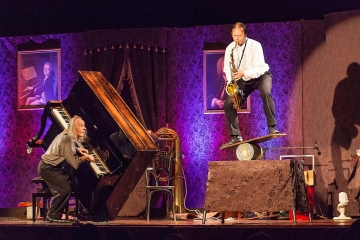 „Concerto Humoroso“, lautet bescheiden der Titel des aktuellen Programms. Tatsächlich war es ein Feuerwerk an Musikalität und Akrobatik, an Witz, Situationskomik, Virtuosität und Körperbeherrschung. Die Grundidee ist scheinbar simpel: Gogol will ein klassisches Klavierkonzert geben, ein Soloprogramm für eine Virtuosen mit den gängigen Titeln der Pianoliteratur. „Concerto Piano solo“, verkündet er immer wieder nach Angabe der Titel, die er zu spielen plant, Werke von Chopin, Schumann, Beethoven oder Bach. Doch kaum beginnt er, entdeckt Mäx, der zunächst als Faktotum dem Künstler Gogol die Frackschöße gerichtet, den Klavierdeckel geöffnet und das Publikum entsprechend angeheizt hat, irgendwo im Raum einen Gegenstand, der sich zum Musizieren anbietet, und beginnt, das Solo serioso in ein Duo infernale zu verwandeln. Mal ist es ein Arsenal an kleineren und größeren Kuhglocken, mal ein Xylophon aus Glas, das Mäx bearbeitet und dem er derart groovige Sounds entlockt, dass Beethovenbachschumann zu Jazz oder Blues werden, zu Balladen von unglaublich melancholischer Schönheit oder zu swingenden Superlativen an Sound.