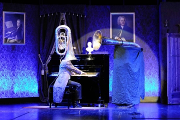 Natürlich lässt Gogol sich das nicht so ohne weiteres gefallen. Doch sobald er versucht, einzugreifen oder sich zu wehren, entsteht ein solcher Tumult, dass einzig waghalsigste Akrobatik die Situation noch zu retten vermag. Da muss er sich, um Mäx am Mitspielen zu hindern, rücklings über den Klavierrücken werfen und von dort die Tastatur bearbeiten (was zu einem atemberaubenden vierhändigen Klavierrückensalto führt); da muss er mit einer windigen Leiter über ein Bühnengestell einen hoch oben befestigten Notenständer erklimmen oder am Ende gar über eine zwischen Klavier und Tuba gelegte Teppichstange balancieren. Und auch, wenn zarter besaitete Gemüter schon die Hand vor die Augen pressen: es gelingt - in bezaubernder, höchst charmanter, stets gefährdeter Schönheit. Piano solo scheint zu siegen.