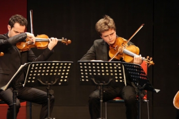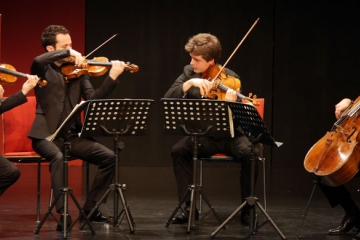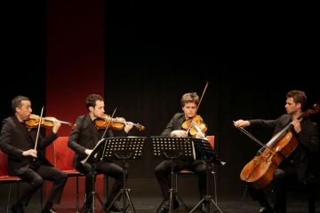 Im Nachhinein ist es nur verständlich, dass sich das Ensemble wünschte, einmal auch „Ainsi la Nuit“ von Henri Dutilleux zu spielen. Gewiss nicht nur, weil der allgemein kaum bekannte französische Komponist dennoch zu den bedeutendsten Komponisten des 20. Jahrhunderts gehört, sondern weil er alle Finessen der zeitgenössischen wie traditionellen Spieltechniken grandios auszubalancieren und in eine absolut schlüssige dramaturgische Form zu gießen verstand. Hier konnten die vier ausdrucksstarken Instrumentalisten alle Register ziehen und auch die Homogenität im Zusammenspiel auf die Spitze treiben. Das großartige dabei ist beim Quatuor Ebène stets, dass dies zwar in voller Konzentration und innerer Anspannung geschieht, doch irgendwie selbstverständlich rüber kommt, als könnten sich die Vier gar nicht vorstellen, dabei etwas falsch machen zu können. Und das ist insbesondere bei Dutilleux eine gewaltige Leistung, ist seine Komposition doch enorm komplex und von einem verwirrend verwobenen Quartettsatz, in dem die rhythmisch-metrische Struktur so gut wie gar nicht erkennbar ist. Doch die vier Musiker verstanden es, Klarheit sowohl in der Anlage wie auch im Inhalt bzw. Text zu schaffen.