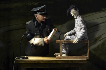 Veranstaltung: Pantaleon Figurentheater: "Wenn du einmal groß bist"„Fritta“, bellt der SS-Mann die klapprige Gestalt in gestreifter Häftlingsuniform an, „Ihr Juden habt immer so tolle Witze. Erzähl mal einen.“ Und Fritta erzählt. Von den beiden jüdischen Attentätern, die vergeblich an einer Kreuzung darauf warten, dass Adolf Hitler mit seinem Konvoi hier wie gewöhnlich um diese Zeit vorüberfährt. „Nu“, sagt der eine zum anderen, nachdem der Konvoi nicht mehr zu kommen scheint, „es wird ihm doch nichts passiert sein?“