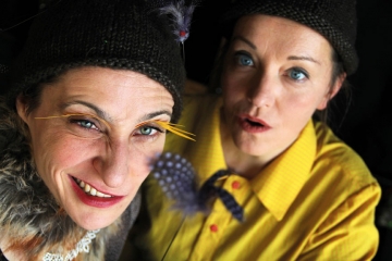Im Zoo wird dann die mürrische Kassiererin mit dem Wischmopf auf dem Kopf zur Zoowärterin, die einmal mit den Haaren durch die Käfige wischt. Das Menschlein wird zum Tier im Käfig, das doch längst schon abfotografiert wurde: mal zum Löwen, der mit seinen Schnurrbarthaaren nicht quer in den Futternapf passt; mal zum Uhu, der enttäuscht ist, dass er heute kein Foto vom Besucher bekommt. Gemeinsam werden beide Spielerinnen zur Riesengiraffe mit Teleskopbesen als Hals und gelben Highheels als Hufen. Bald schon weiß man nicht mehr, wer eigentlich wen spielt und wer zuvor wer war.