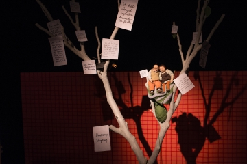 Veranstaltung: Theater Zitadelle: Frau Meier, die AmselFrau Meier - „Meier mit i und nicht mit y“ - hat Angst. Angst, sich zu blamieren. Angst, dass Herbert, ihr Mann, aus dem Bett fällt. Überhaupt Angst, irgendwo herunterzufallen. Dann diese großen Ängste. Dass der Kuchen verbrennt oder ein Flugzeug in ihren Garten stürzt. Dann wären die Radieschen kaputt und überhaupt: wo sollen denn die ganzen Leute aus dem Flugzeug wohnen? „Meinst du, dass der Kuchen für so viele Leute reicht, Herbert?“ fragt Frau Meier ihren Mann. Den haut es fast vom Gartenstuhl, als er von dem abgestürzten Flugzeug erfährt. „Aber das hast du dir doch nur wieder ausgedacht“, brummelt er und rät seiner Frau, alle ihre Ängste auf weiße Papierblätter zu schreiben und an den Baum zu hängen. Die verwelken dann nämlich im Herbst, fallen vom Baum und sind verschwunden.