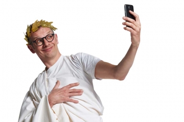 Als Zeitzeuge erscheint Zeus, derzeit „Göttervater a.D.“, der mit seinem Team aus Spezialisten seinen eigenen Niedergang erlebte, als die „judäischen Billiganbieter“ den Markt eroberten und „unendliche viele Freiminuten“, also ein Leben nach dem Tod, versprachen. Und so schlägt sich Apollo jetzt als Optiker durch, Hermes hat einen Postversand aufgezogen und Nike macht in Turnschuhen. Gemeinsam stapft man auch über die „Müllhalde der Geschichte“, wo die „historischen Ballaststoffe“ neben der vermeintlich guten alten Zeit herumliegen.