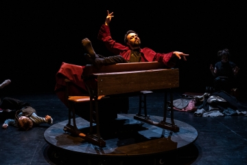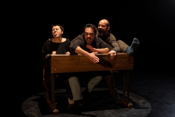 Vieldeutig ist auch, was das aus jungen Menschen und Profis bestehende Ensemble bei seinem Gastspiel im bosco anbietet. Sie lassen das Publikum teilhaben an ihrer Ensemblearbeit. Fast immer sind alle Spielerinnen und Spieler anwesend, sei es nahezu unsichtbar im Hintergrund, sei es zuschauend teilhabend am Szenenrand oder eben mittendrin. Eine hölzerne Drehscheibe, darauf ein altes Schulpult markiert die Szene, am Rand liegen Kostüme bereit. Die Bühne ist als schmaler Steg in den Zuschauerraum hinein verlängert, am Ende dieses Steges steht ein Miniatur-Schulpult, als warte es auf ein Puppenspiel. Mindestens ebenso wichtig für die Gestaltung der Szene, des Bildes ist die Sprache: in fünf Sprachen - Deutsch, Schweizerdeutsch, Italienisch, Französisch und Englisch - nehmen die Spielerinnen und Spieler die Geschichte, so wie sie sich ihnen vermittelt, in den Mund, schmecken die Sätze ab, prüfen sie auf ihren Gehalt, ihren Rhythmus, ihren Klang, spielen mit dem Text wie mit einem federleichten Material.