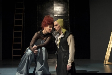 Illegitime Gewalt als Mittel der Politik und der Clash der Glaubensbekenntnisse sind Schillers „Maria Stuart“ durchaus als zentrale Konflikte eingeschrieben. Im Programmheft verweist ein Textauszug von Ferdinand von Schirach auf die völkerrechtlich zweifelhafte Tötung Osama Bin Ladens durch US-amerikanische Soldaten am 2. Mai 2011. Auch Königin Elisabeth muss sich schließlich von der gefangenen Konkurrentin um den Thron vorwerfen lassen, sie völkerrechtswidrig festzuhalten. Allerdings lässt sich Schultz, die wir schon als Schauspielerin bei der Shakespeare Company kennen, nicht zu einer Zuspitzung auf diesen Aspekt verführen. Sie behält den Originaltext weitestgehend bei – eingeschoben sind lediglich zwei Passagen, in denen die Protagonistinnen selbst zu Wort kommen, aus dem Off eingespielte Auszüge historischer Zeugnisse.
