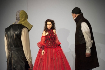 Gewissenhaft behandelt Schultz diese verschiedenen Ebenen des Stücks, der Text ist nur leicht zugunsten der beiden Kontrahentinnen gerafft, von den Männerfiguren bleiben lediglich vier, die sich Michael Meyer (sehenswert vor allem als eitler Leicester, aber auch als ehrpusseliger Paulet) und Markus Seuß (Mortimer und Burleigh) teilen.