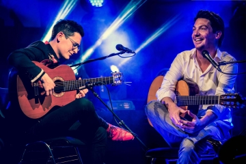 „Schön, dass Sie an diesem Brückentagwochenende nicht in Urlaub gefahren sind“, freut sich Jan Pascal und verspricht dem Publikum im nahezu ausverkauften Saal einen ganz anderen Urlaub. Gut zweieinhalb Stunden Auszeit vom Alltag und ein Eintauchen in eine Welt, die geprägt ist von einem gemeinsamen Rhythmus, einander suchenden und findenden Harmonien und rasanten Dialogen auf zweimal sechs Saiten - wenn das nicht ein wahres Brückentagerlebnis ist!