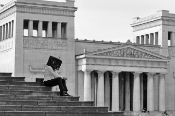 Ein Mann trägt eine schwarze Aktentasche auf dem Kopf. Er sitzt am Fluss, kauft ein, überquert die Straße, liest - alltägliches Leben. Eine Aktentasche auf dem Kopf zu tragen, schränkt die Sinne ein. Er kann nicht wissen, was um ihn herum passiert, er sieht, riecht und hört nichts.