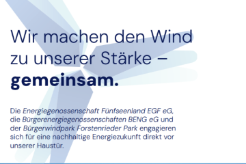Die Bürgerenergiegenossenschaft BENG eG (München) und die Energiegenossenschaft Fünfseenland eG (EGF) ermöglichen die direkte Beteiligung von Bürgerinnen und Bürgern. Gemeinsam mit den Gemeinden Baierbrunn, Neuried, Pullach und Schäftlarn entsteht so ein Leuchtturmprojekt für kommunalen Klimaschutz, regionale Wertschöpfung und bürgerschaftliche Mitbestimmung.