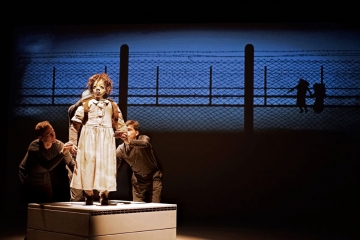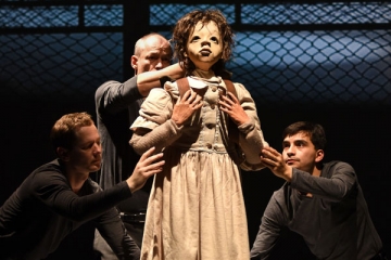 Flüchtlinge beschäftigt. Das nur dreiköpfige Ensemble überraschte und überzeugte in einem dutzend Rollen, mit wunderbarem Puppenspiel und auch als Protagonisten eines weit -