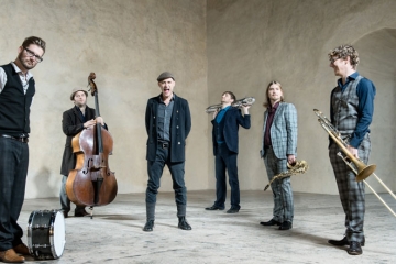 Wohl nie zuvor wurde das bosco-Jazz-Publikum mit einer solchen Form musikalischer Unberechenbarkeit konfrontiert: Sechs Mann, die sich auf den ersten Horcher an gar keine Spielregeln zu halten scheinen, bis einem dämmert, dass bei den Schweizern alles bis ins kleinste Detail einem Masterplan unterliegt und eben wie ein Schweizer Uhrwerk funktioniert. „Hildegard lernt fliegen“ besteht aus drei „echten“ und einem „falschen“ Bläser (mehr davon später), aus Kontrabass (Marco Müller), Schlagzeug/Marimba (Christoph Steiner) und eben dem Vokal-Virtuosen und Komponisten Schaerer, der mit seiner beatbox-artigen Stimmakrobatik locker eine Trompete samt Dämpfer ersetzt. Dem gerne staccato- bis Bop-mäßigen „Gebläse“ (Matthias Wenger, Tenor- und Sopransaxophon, Flöte; Andreas Tschopp, Posaune, und Benedikt Reising, Bariton- und Altsaxophon) steht also ein viertes Element entgegen, das immer wieder aus der Reihe tanzt oder sich auch mal zu einem Duett Vokal/Sax einfindet – für den Zuhörer ist es auch optisch ein Ereignis, wenn Instrumentalist und „Naturalist“ Seite an Seite agieren. Schaeber spricht zwischendurch von einem „symphonischen Projekt“, das eigentlich von 66 Musikern, Streichern und Gong „orchestral“ und nicht nur sechst in die Tat umgesetzt werden sollte: „Das ist anstrengend, wir wären gerne mehr“, sagt Schaerer, "vielleicht spielen wir mal wieder in einer dieser großen Hallen?“