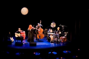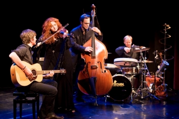 Am Ende war nur noch die Gießkanne, Hauptdarstellerin des schönsten Fade Out, das im Bosco jemals zu erleben war: Percussionist Wolfgang Lohmeier hatte noch letzte, sachte verebbende Klopfzeichen auf dem Garteninstrument gegeben, dann war auch er ins Dunkel entschwunden, das die nunmehr stille Bühne einhüllte. Kontrabassist Alex Haas hatte diesen Geniestreich komponiert, der das Bosco-Publikum praktisch zur Nachtruhe bettete – inoffizieller Titel des sanft entschlummernden Stücks: „Liebeslied für eine Gießkanne“. Haas, vielen Konzertbesuchern vom Duo „Unsere Lieblinge“ (mit Stefan Noelle) her ein alter Bekannter und nach eigenen Angaben derzeit bei insgesamt 23(!) verschiedenen Musiker-Formationen mitwirkend, hatte mit seiner Komposition den Schlusspunkt eines Abends gesetzt, der konsequent auf die Variabilität aller beteiligten Instrumente setzte: Die Violinistin Martina Eisenreich, der Gitarrist Christoph Müller, der mit einem halben VW-Bus voller perkussiver Wunderdinge ausgestattete Lohmeier und der Bass-Zauberer Haas haben sich ja nicht zufällig gefunden – alle Vier eint die Experimentierfreude, die Lust am Crossover, der Spaß am Ausreizen der klanglichen Möglichkeiten. Mit dem Programm „Contes de lunes“ (Mondgeschichten) hatte Eisenreich allenfalls ein Stichwort vorgegeben für das, was sich dann tatsächlich gut zweieinhalb Stunden lang abspielte: Zu Gehör gebracht wurden „Stücke“, die mittendrin die Tonart oder auch den Stil wech-seln können und so gar nicht in feste Kategorien passen – es gibt zwar Strukturen, aber diese scheinen nur Anleitungen zu sein für das Verlassen des festen Bodens, auf dem sie gründen. Die hier musikalisch entfachten Stimmungen können sich jäh von meditativ zu enthusiastisch wandeln, ein verhaltener Beginn sich zum rasenden Tempo steigern, die Führung zwischen Geige, Bass, Schlagwerk und Gitarren hin und her gereicht werden wie ein Staffelstab - nichts ist gewiss. Allein Wolfgang Lohmeiers Equipment beeindruckt schwer, auch optisch: Ein aufs Contra-C gestimmtes Paukenfell in drei Metern Höhe, von dem eine Klaviersaite mit Eisenkorpus herabhängt, wirkt wie eines dieser Stelzenwesen aus „Krieg der Welten“ - und bringt sogar ähnlich bedrohliche Geräusche hervor. Dass Martina Eisenreich unter Inanspruchnahme solcher extraterrestrischer Gebilde zuweilen Musik für Horrorfilme komponiert, verwundert da kaum noch. Doch selbst über die bizarrsten Perkussionstiefen wölbt sich noch ihr schöner Geigenton, der manchmal leicht „irisch“ angehaucht ist, manchmal an Sarasate erinnert und dann wieder an Wiener Schrammeln oder Gipsy – einmal gestatten sich die Vier sogar einen Schlenker Richtung Yankeedoodle. Einer der Höhepunkte fiel dabei völlig aus dem Kontext: „Liebling, mein Herz lässt dich grüßen“, mit schluchzender Grammophongeige und Kunstpfeife serviert, trieb einem geradezu Tränen der Rührung in die Augen. Ein anderes Mal meinte man der seidenzarten chinesischen Musik aus einem Ang-Lee-Film zu lauschen. Dann wieder Christoph Müller mit feinen Hall-Effekten auf der Gitarre oder der uneitle Lohmeier mit einer Percussion auf dem eigenen Bierbauch. Oder Martina Eisenreich mit einer „Tin Whistle“, einer kleinen Blechflöte, die angeblich zum Verkaufsschlager geworden ist. Und mitten drin Alex Haas, der Bassisten-Fels in der Brandung, allzeit den Schalk im Nacken und zu jeder Überraschung bereit. „Eigentlich haben wir uns übers TETRIS-Spielen kennengelernt“, flunkert Martina, „wir üben so das Packen und Auffüllen von Lücken für unseren VW-Tourbus.“ Es dürfte in der Tat eng werden, wenn vier Musiker und ihr Tonmischer und all die Instrumente in den Bus sollen. Und am Ende ist da ja auch noch diese Gießkanne.
