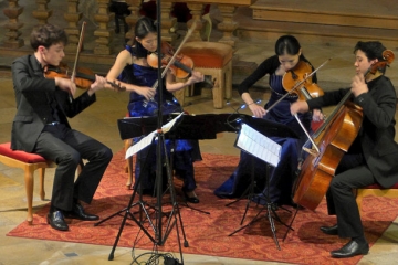 Die nächste Station wäre also die Romantik mit ihren emotionalen Werten, die mit den Formalismen der Klassik nicht mehr viel anfangen konnten. Es war denn auch nicht falsch, hier in Schumanns Streichquartett F-Dur op. 41/2 die Zügel zu lockern und sich schon mal der Schwärmerei oder Euphorie hinzugeben. Auch wenn in diesem Ergebnis „quartettistischer Gedanken“ (Schumann im sogenannten Haushaltsbuch) eingehende Studien von Werken Haydns, Mozarts und Beethovens deutlich belegbar sind, legte das Quatuor Hermès plausibel dar, dass dem ästhetischen Konzept eindeutig die Idee der Romantik zur formalen Vereinheitlichung hin zugrunde liegt. Die Werkentwicklung (im Ganzen und in den einzelnen Sätzen) vollzog sich denn auch unter einem großen Spannungsbogen. Vereinheitlichung bedeutet bei Schumann aber keinesfalls Einförmigkeit. Und das bewies das Ensemble nicht nur im auf die Veränderungen explizit angelegten Andante-Variationssatz, sondern vordringlich in den nachfolgenden schnellen Sätzen, die ihre Kraft vor allem aus extremen rhythmischen Wechseln schöpften, die das Ensemble so selbstverständlich und bravourös vollzog, dass man den Grund für die unterschwellige Spannung kaum ausmachen konnte.