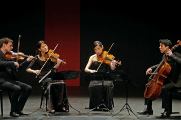 Anders bei Anton Webern. Dem radikalen Neuerer wäre es auch nicht einmal im Traum eingefallen, etwas zu verbergen oder zu verschleiern. Seine Fünf Sätze für Streichquartett op. 5 wollen nichts anderes sein als sie sind: absolute Musik, die nicht nur die Tonalität abgelegt hat, sondern auch jegliche Thematik. Mit dem neuen Parameter der Geräusche mittels zeitgenössischer Spieltechniken erschuf Webern fünf aphoristische Plädoyers für die Befreiung von jedweden Ballast, also von allem, was über die rein inhaltliche Aussage hinausgeht. Und das Quatuor Hermès zeigte mit höchster Konzentration und Spielintensität, dass die Reduktion auf den Kern eine musikalische Bereicherung sein kann, vor allem in Sachen Intensität, Atmosphäre, Rhetorik und Erzähltechnik.